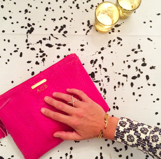 How beautiful is the tablecloth that artist Dorothy Shain created for the dinner? I wanted to take it home! Gigi New York All In One Clutch // Baublebar Crystal Mason Ring (only $32) // Julie Vos Chloe Open Bangles