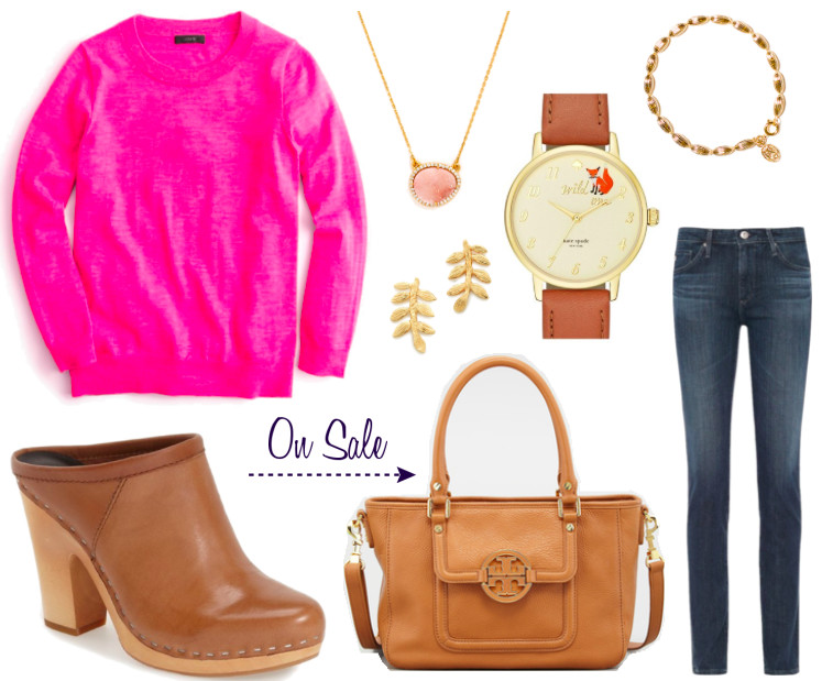 J.Crew Tippi Sweater // Tory Burch Amanda Mini Satchel Crossbody (on sale) // AG Contour Jeans // Gorjana Leaf Studs // Dolce Vita Mules in Saddle // Baublebar Druzy Necklace // Kate Spade Watch // Charleston Rice Beads Bracelet