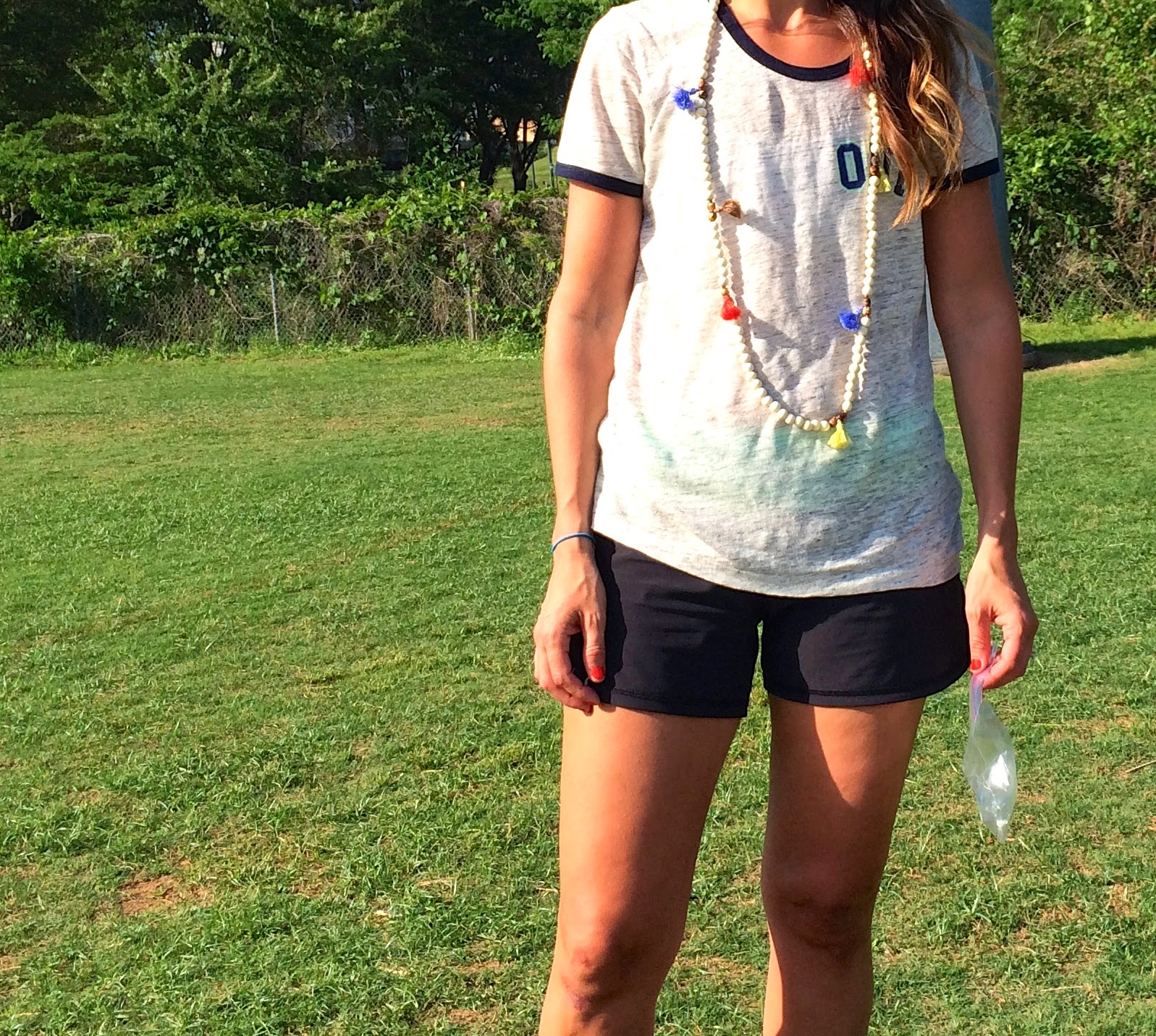 I wore this J.Crew top yesterday and love how lightweight it is for summer. Pardon the off-center image. This was W’s attempt at taking a photo of me. The front says “Oui” and the back says “Mon Cheri” – Yes – My Dear/My Darling. Tassel Necklace is Melvin.