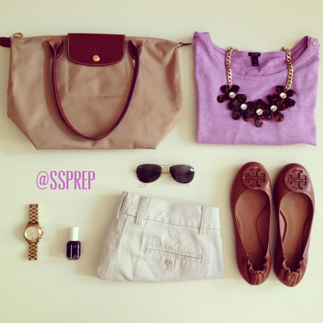 Longchamp Small Le Pliage // J.Crew Painter Button Boatneck Top (on sale) // J.Crew Tortoise Floral Necklace (sold out, very similar HERE) // Michael Kors Watch // Essie After School Boy Blazer // Ray-Ban Aviators // J.Crew Chino Shorts (on sale) // Tory Burch Revas in Royal Tan