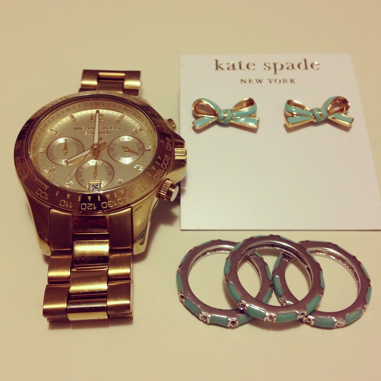 Michael Kors Watch (old, similar HERE) // Kate Spade Bow Earrings // Baublebar Stack Rings