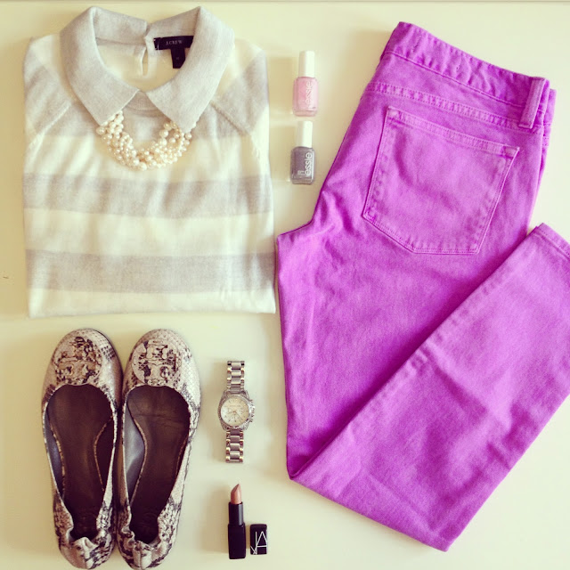 J.Crew Peter Pan Sweater (currently on sale, $69.99) // Hazel&Marie Twisted Pearls // Essie Muchi, Muchi // Essie Chinchilly // J.Crew Toothpick Jeans in Neon Violet (currently on sale) // Tory Burch Revas in Python (old, similar HERE) // Michael Kors Watch (less expensive HERE than most places) // Nars Lipstick in Promiscuous // J.Crew Pearl Studs