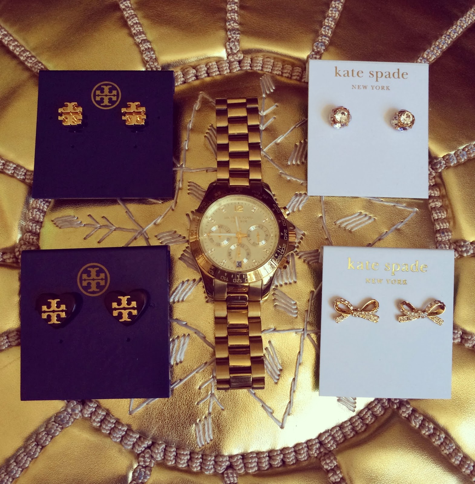 Tory Burch Small Logo Studs // Kate Spade Marmalade Studs // Tory Burch Tortoise Heart Studs // Kate Spade Pave Bow Studs // Michael Kors Watch // Lulu & Georgia Gold Pouf