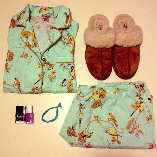 Bedhead Pajamas (old, but I also have THIS pair that is still available in all sizes, that I LOVE, and is currently on sale for $39 off) // Ugg Slippers // Butter Marrow Polish // Essie Play Date Polish // Emi-Jay Hairband