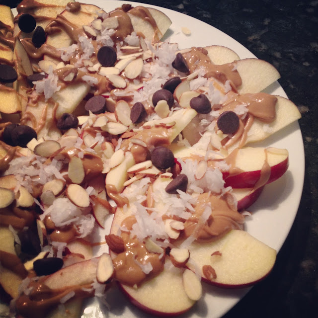 Simply slice apples, drizzle melted peanut butter over them, and sprinkle chocolate chips, almonds and coconut on the top.