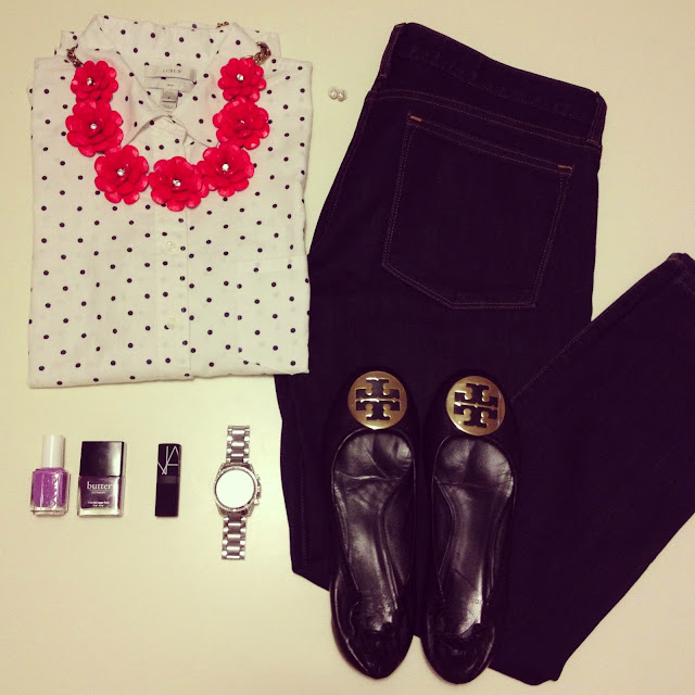 J.Crew Beaded Floral Necklace (sold out, but call 800 261 7422 and they’ll help you find it!) // J.Crew Boy Shirt in Dots // J.Crew Toothpick Jeans in Classic Rinse // Nars Lipstick in Casablanca // Michael Kors Silver ‘Blair’ Watch // Tory Burch Reva Flats // Anthropologie Pave Post Earrings