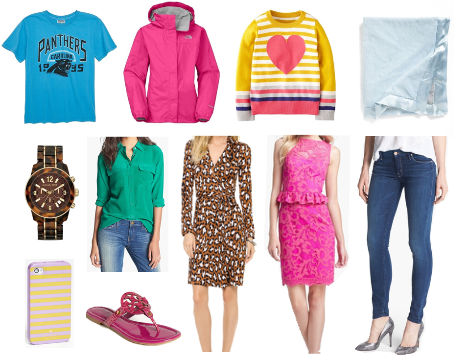 Junk Food Boys’ Carolina Panthers Tee // The North Face Girls’ Resolve Rain Jacket // Mini Boden Girls Intarsia Heart Sweater // Little Giraffe Luxe Duo Blanket // Michael Kors Preston Tortoise Watch // Equipment ‘Signature’ Silk Shirt // DVF Silk Wrap Dress // Lilly Pulitzer Kiri Peplum Dress // Mother ‘The Skinny’ Jeans in a Sea of Secrets // Kate Spade iPhone Stripe Case // Tory Burch Miller Sandals in Party Fuchsia Croc
