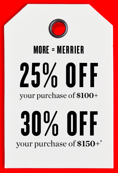 Use code MERRYMERRY at J.Crew and take 25% off when you spend $100+ and 30% off when you spend $150+.