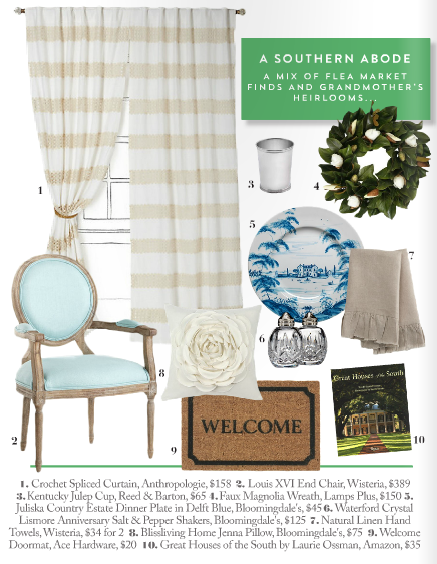 Sitting on the Dock of the Bay is still one of my all-time favorite songs. Well, that one and Al Green’s Let’s Stay Together (the hubs and I danced to it at our wedding). As for Southern Belle Names, I love that they included Maisie. It’s one of my grandmother’s names, and she spelled it exactly like that. Gone With the Wind is still my most favorite movie ever. I think the first time I watched it was when I was five years old, and have probably seen it over a hundred times. All of the food in the Southern Dining section has my stomach seriously growling. LOVE it all, especially pecan pie! And how fabulous is the end chair in Wisteria. If I had a walk-in closet, that would most definitely be in it!