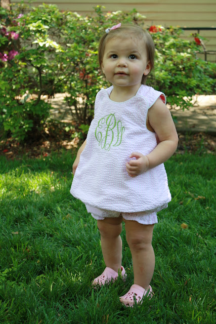 Many of you inquired about the pink, monogrammed seersucker pinafore dresses the girls wore Easter afternoon. Even better, they’re reversible! Here are both sides.