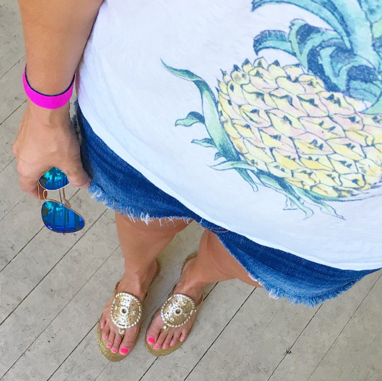 It’s no secret I love anything that’s soft and comfy. Who doesn’t? This pineapple tee that I picked up a few weeks ago at the J.Crew here in town is just that, just the right amount of worn in. Paired here with these sparkle jellies and these sunnies. My cutoffs are sold out, I have this similar pair also, and love them!