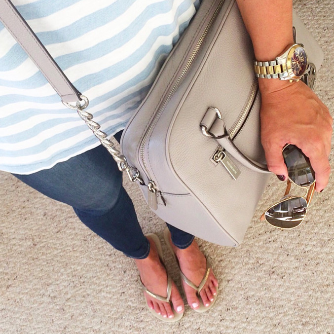 Striped Tee // Jeans (similar and on sale here) // Flip Flops (similar and on sale here, only $17) // Grey Satchel (similar and on sale here) // Watch (similar and on sale here) // Sunglasses (similar and on sale here)