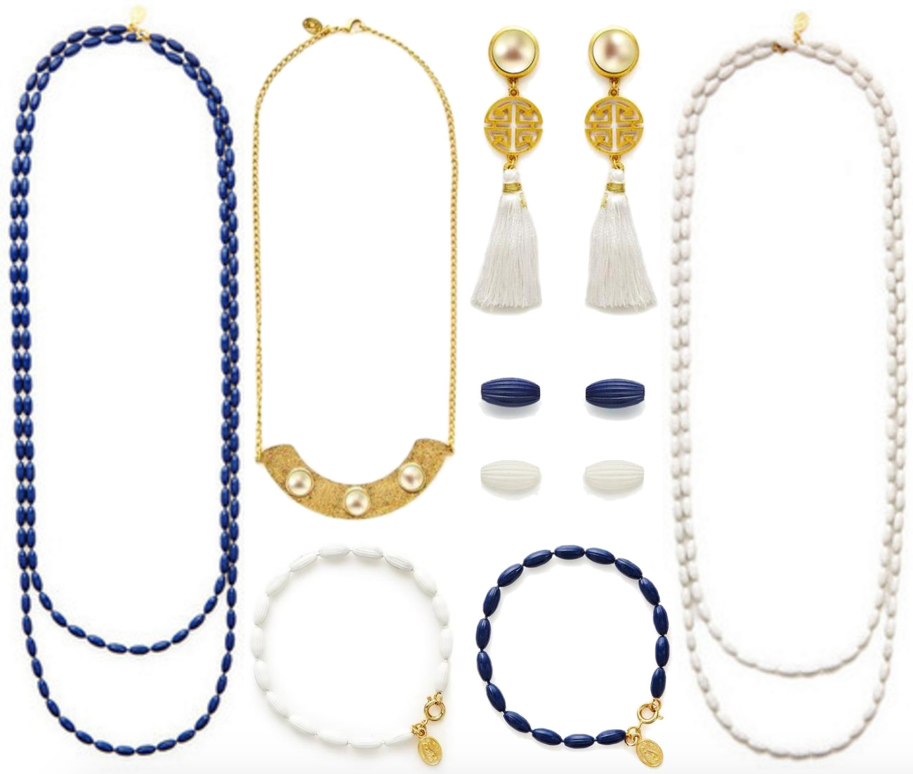 Navy Necklace // White Necklace // Navy Bracelet // White Bracelet // Navy Studs // White Studs // Tassel Earrings // Crescent Necklace