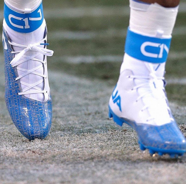 Cam wearing his entire team’s names on his shoes during practice.