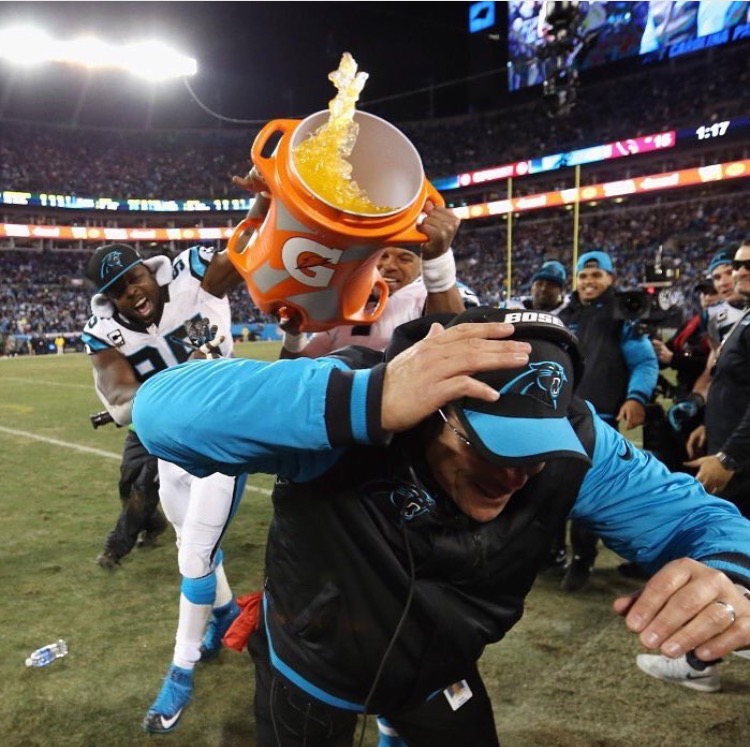 Panthers head coach, Ron Rivera, getting splashed by Charles Johnson and Cam Newton!