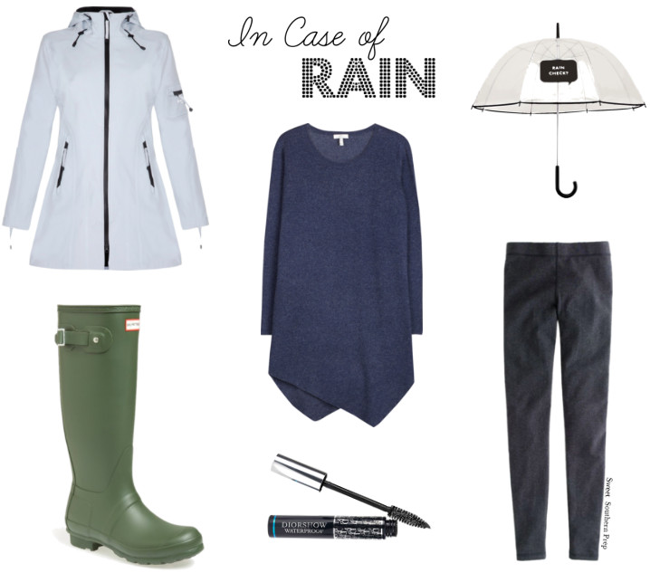 Leggings // Rain Boots // Waterproof Mascara // Asymmetrical Sweater Tunic // Umbrella // Raincoat