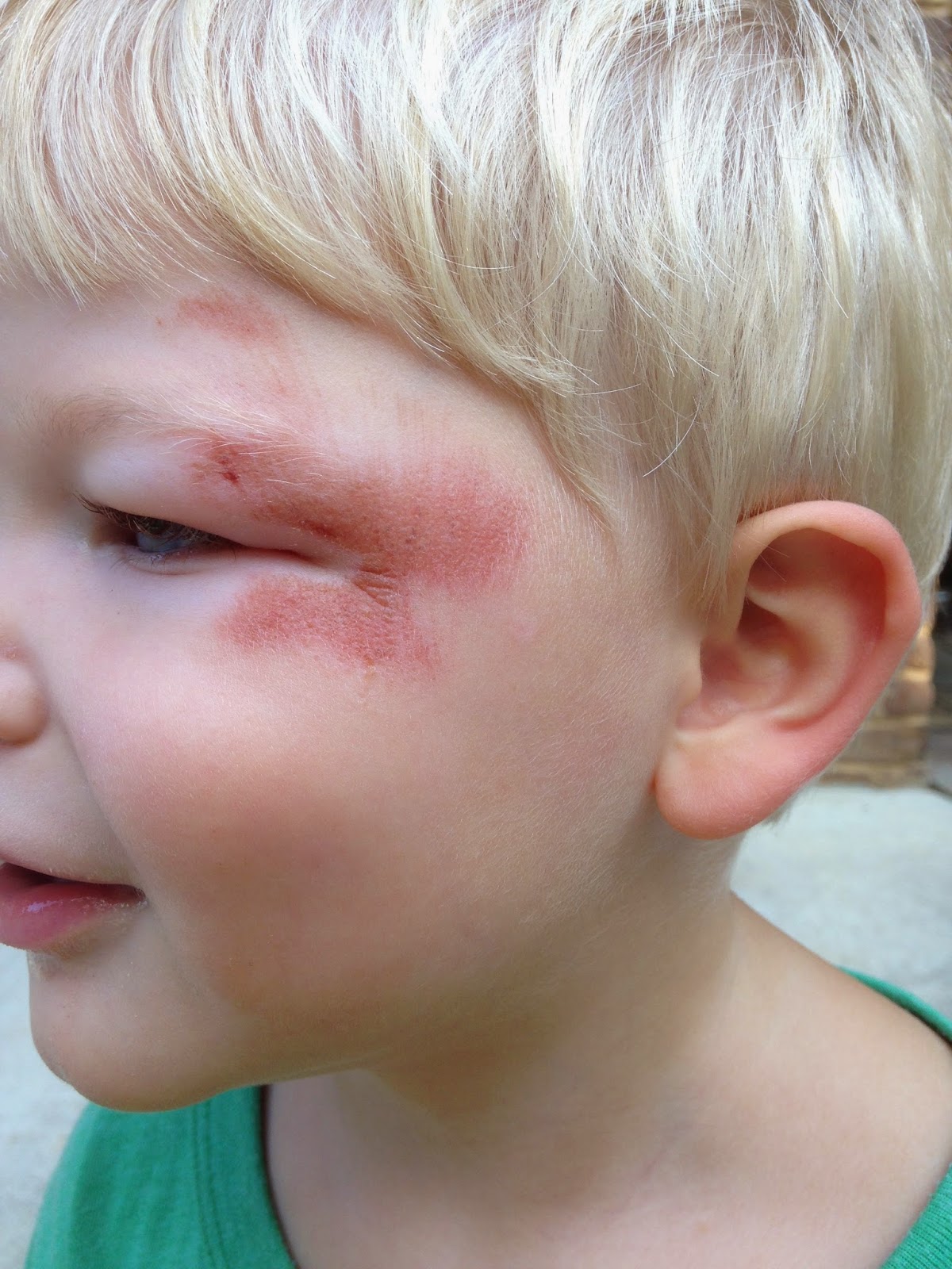 So last week, Logan tripped over a basketball and face-planted on my parents’ driveway. I realize it looks really bad here, but this was right after it happened and it was still pretty swollen. He was a trooper and barely cried. Thankfully, his actual eye wasn’t effected.