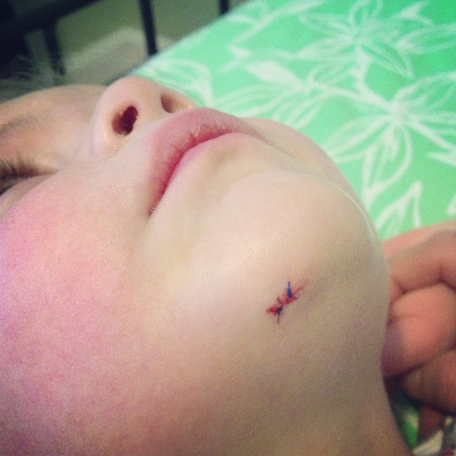 Yes, that’s little E’s chin. Yesterday afternoon, we were playing in L’s room, and she tripped on something on the floor and fell into the side of the bed. As soon as she did it, I knew it need stitches, so I phoned my dad (a surgeon), and he came over. Thankfully, it didn’t bleed too much, because it was a clean cut, so she didn’t freak out. She was so brave, and only cried when he actually did the stitching.