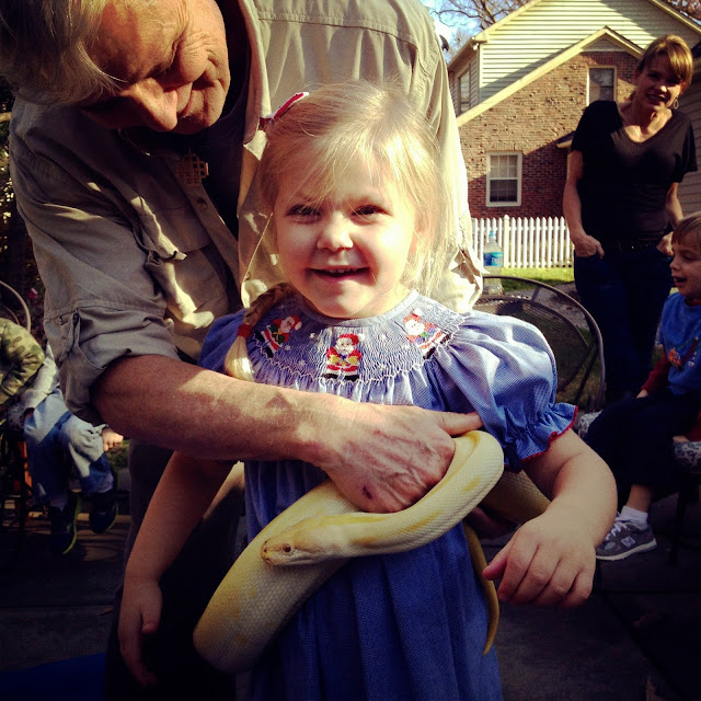 On Saturday, W attended a birthday party, and was very entertained by all the animals. While I loved watching her excitement, my stomach dropped every time he brought a snake out. Still hate them. And the man asked if anyone wanted to stick their head into an alligator’s mouth…W was the only volunteer.