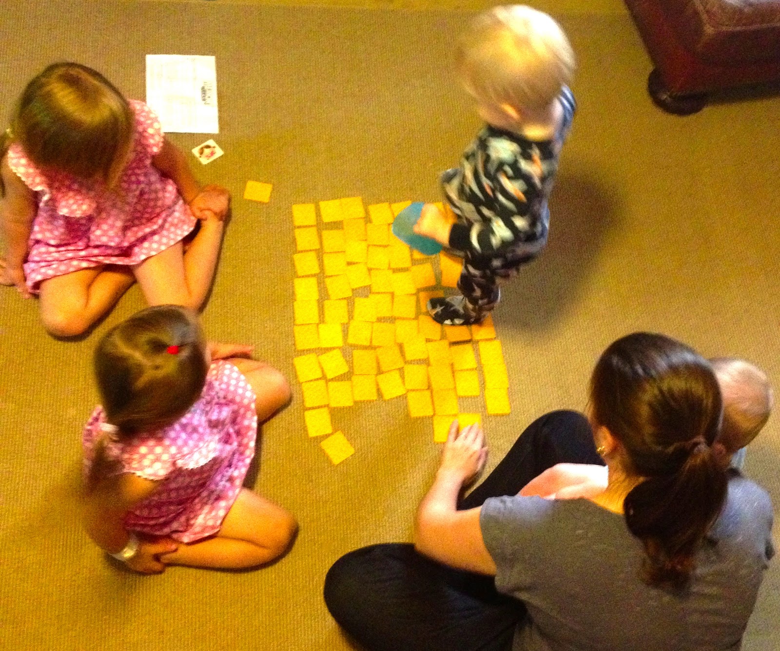 My sister-in-law was in town this week. We celebrated the hubs’ mother on Tuesday night, and cooked dinner for her. W is currently obsessed with Memory…and is surprisingly really good at it. We normally wait until after L goes to bed, because if we don’t, this is what happens.