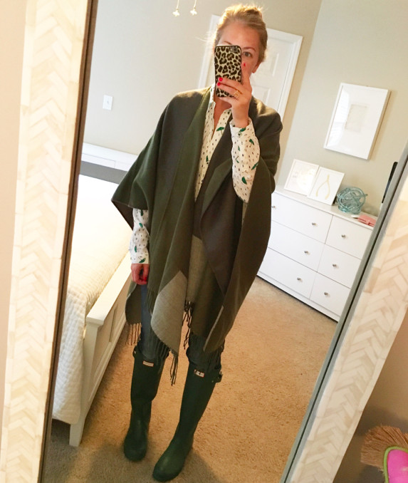 Reversible Cape (only $34, it’s almost sold out, but keep checking back, they seem to restock it daily) // Umbrella Blouse // Hunter Boots // Ring // iPhone Cover