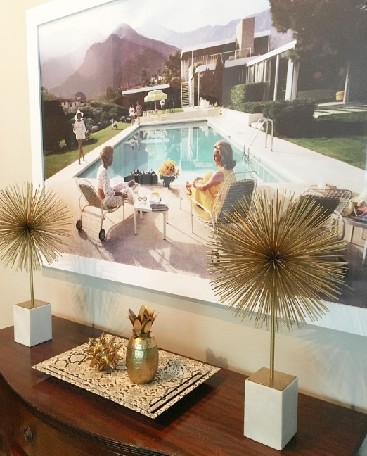 Since we had company coming over on Sunday for the Super Bowl, I spruced things up just a little bit more. As we’re in a rental, I’ve had so many things still in boxes, but every so often I get the urge to pull more pieces out. After I finally brought this huge Slim Aarons piece that I bought back in November home with me last week, I used some of my pieces to decorate around it. Later on I’m thinking I’ll add a bar area under it, but for now, my python trays, little pineapple candle (similar here) and star urchin will do. I had these starburst stands on our mantle in our old house. Since our tv is over the mantle now, I decided to move them here, for the time being.